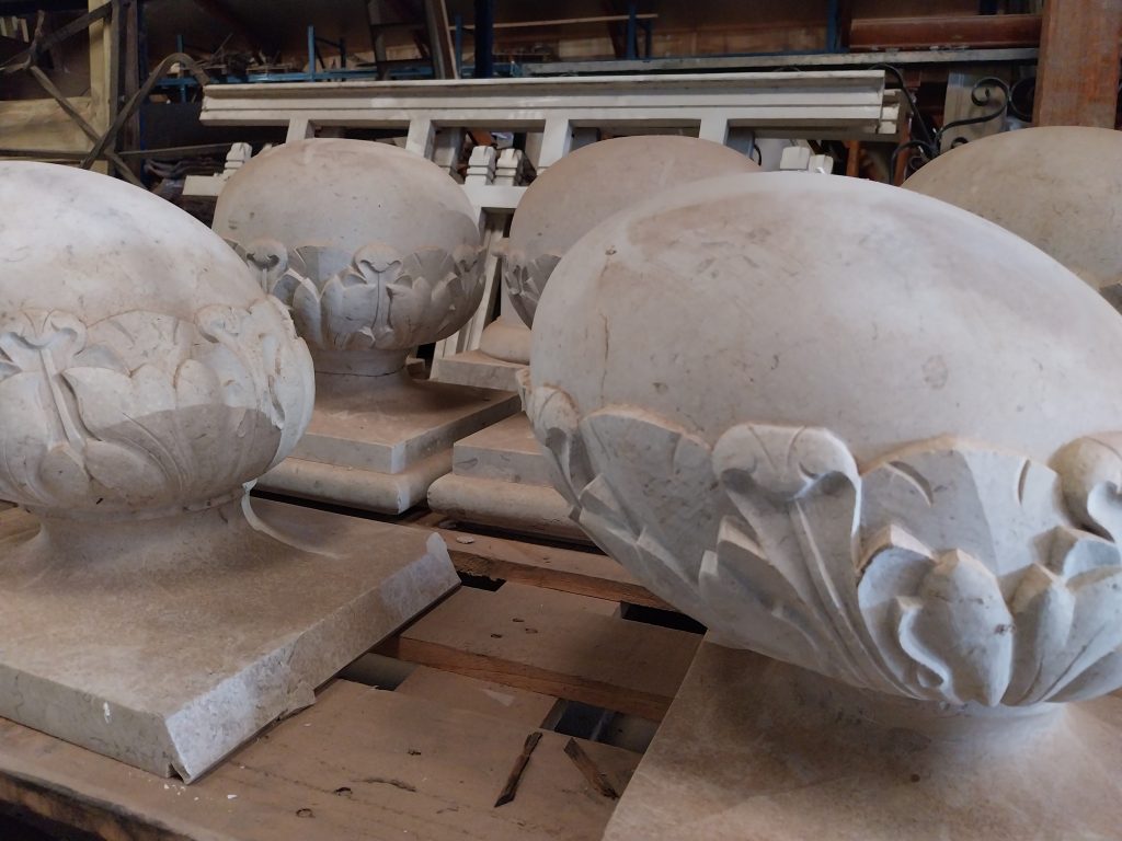 Hij leidt ons rond langs een aantal bijzondere items die te koop zijn tegen een vriendelijke prijs. We stoppen eerst bij een aantal mysterieuze bollen. ,,Die liggen er al een tijdje”, zegt Mark. Het gaat om sierelementen voor een trapbalustrade.